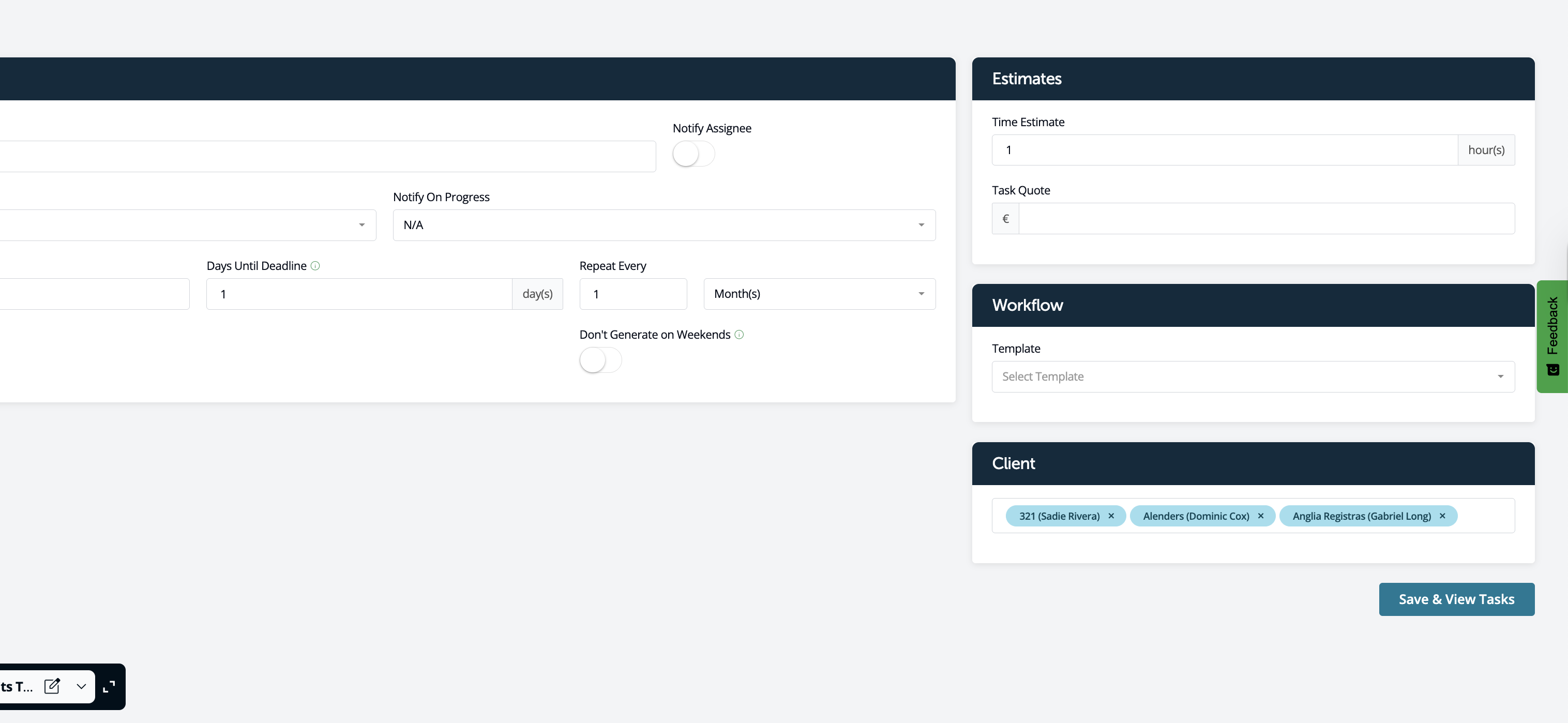 When creating a recurring task – selection of multiple companies/clients to apply task to would be very beneficial and save time.